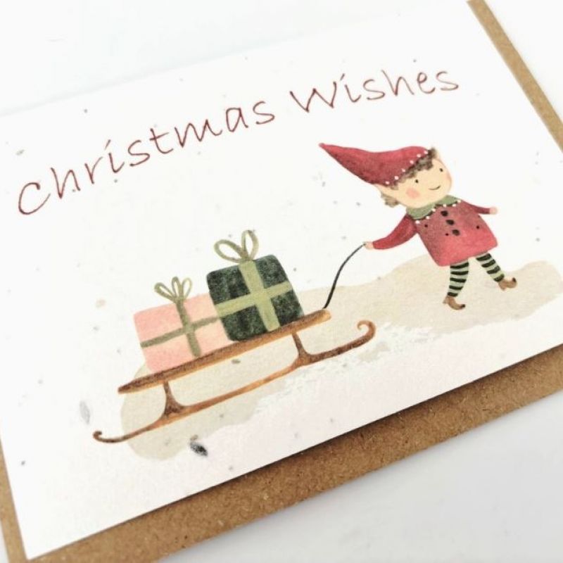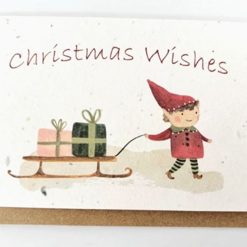 This fun Elf Sleigh plantable seed paper card is made in the UK from 100% recycled cotton waste seed paper which is acid free and chemical free.