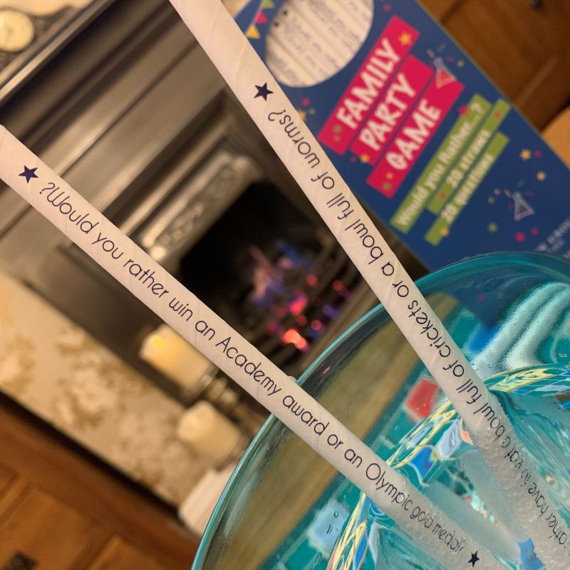 20 environmentally friendly paper straws in a recyclable box, each straw has a ‘Would You Rather Question on it’.