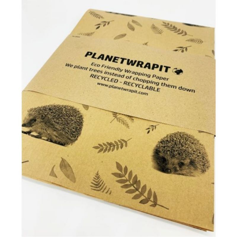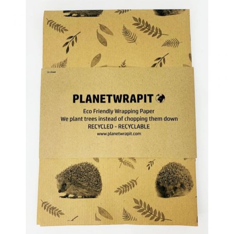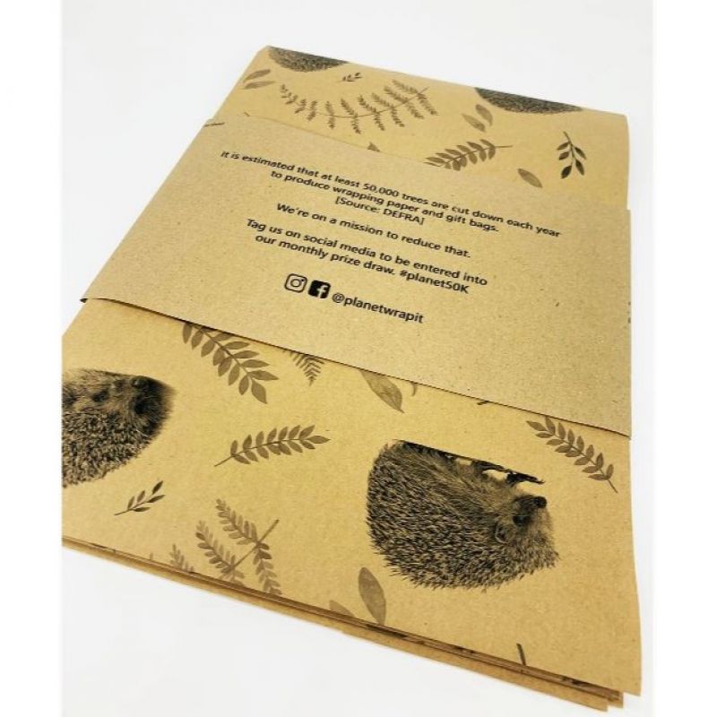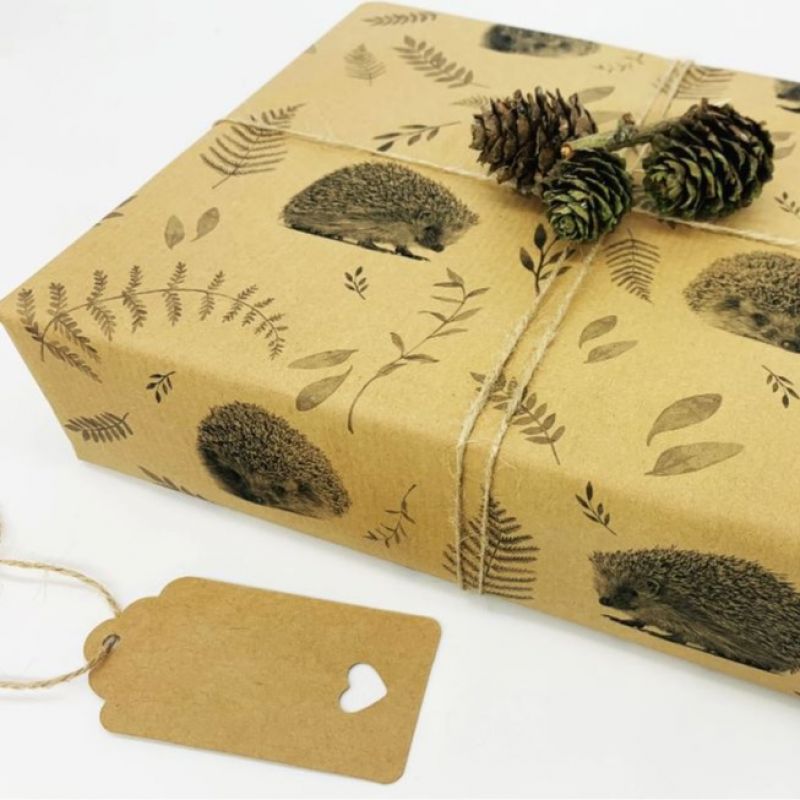 A popular hedgehog print using black ink on natural, recycled kraft wrapping paper.