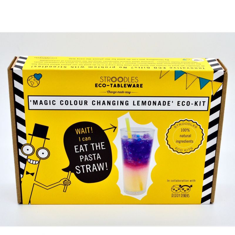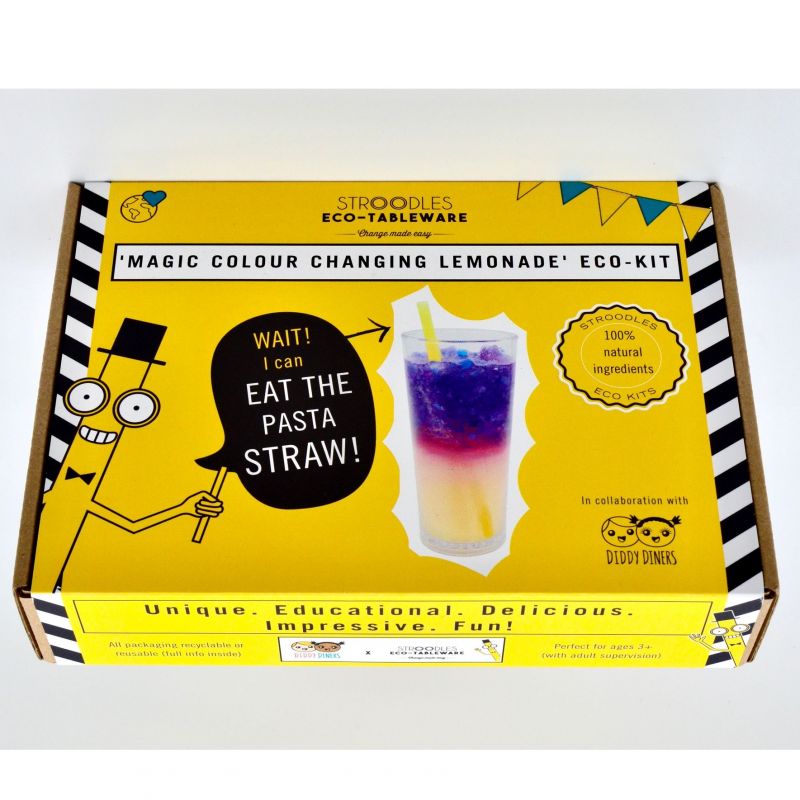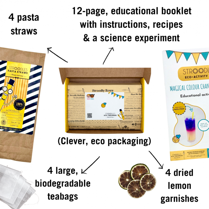 This kit shows children (3+) how to fill tea bags with the leaves of a (secret) everyday vegetable. Children will be surprised when water naturally turns a vibrant blue colour and further wowed by a secondary colour change that awaits when they add a little lemon juice (thereby changing the pH). A little honey is added to sweeten the lemonade and the (included) Stroodles pasta straws and dried lemon garnishes provide an exciting and sustainable way to enjoy the drinks.