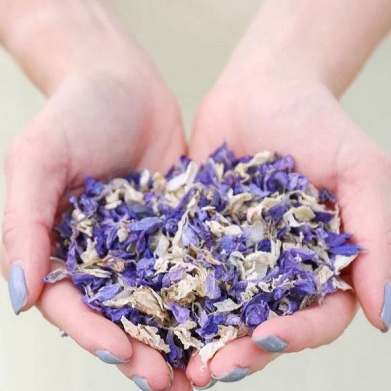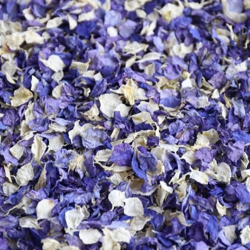 A gorgeous mix of Purple (Amethyst), Ivory (Icing Sugar), and Lilac (Midnight Bloom) delphinium petals. Ideal for weddings with a purple colour theme, or couples looking for a rich confetti colour which will show up well on photographs.