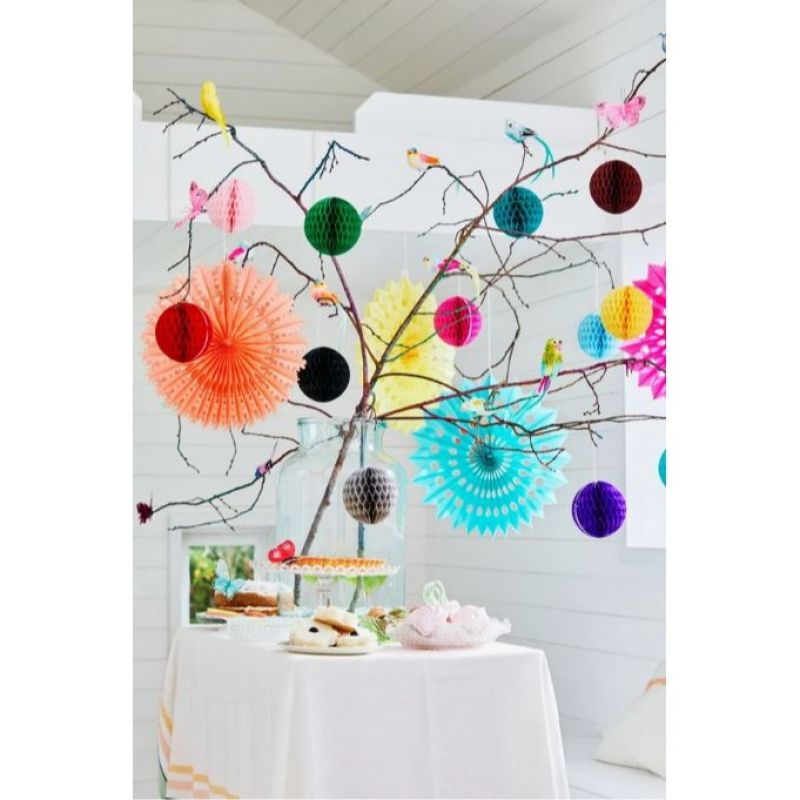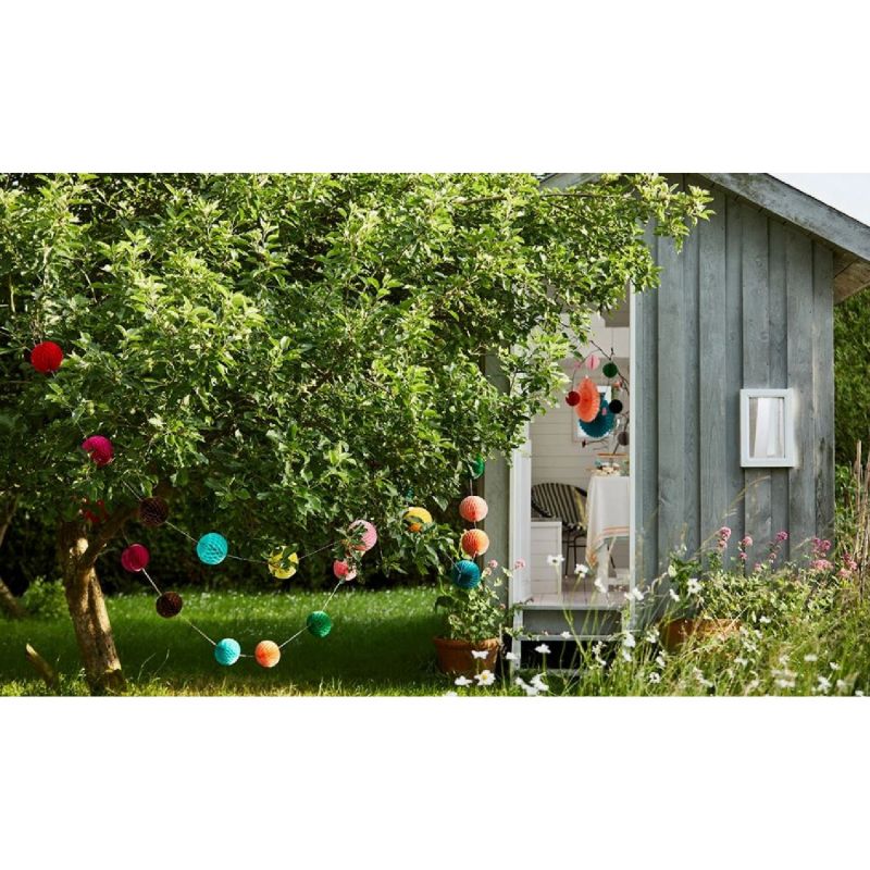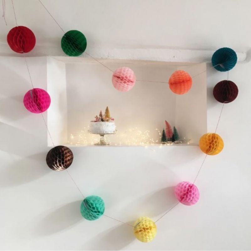 This gorgeous ready-made paper ball garland arrives folded flat in a calico bag (bag design may vary). To display, simply open out each ball and seal with the tape or paper clip provided. When the party is over, you can flatten it and pop back in the bag ready to use again.