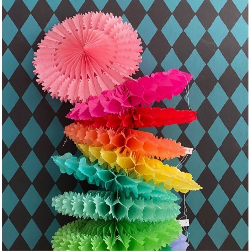 Eco friendly yellow paper fan decoration. Easy to hang up with the supplied thread. Once the party is over, it can be folded flat and put away until needed again.
