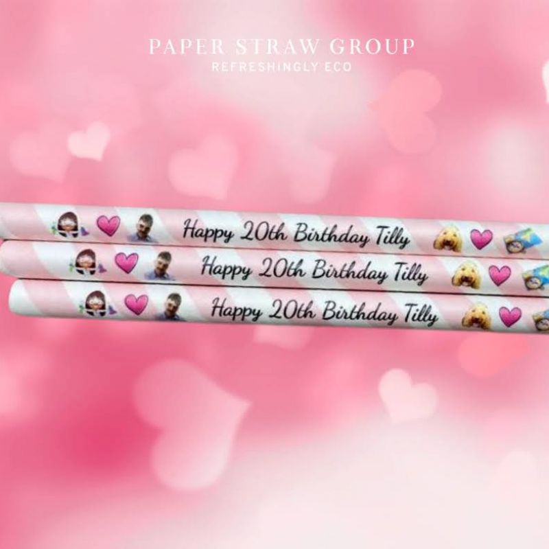 quality pink & white stripe paper drinking straw can be personalised with your name