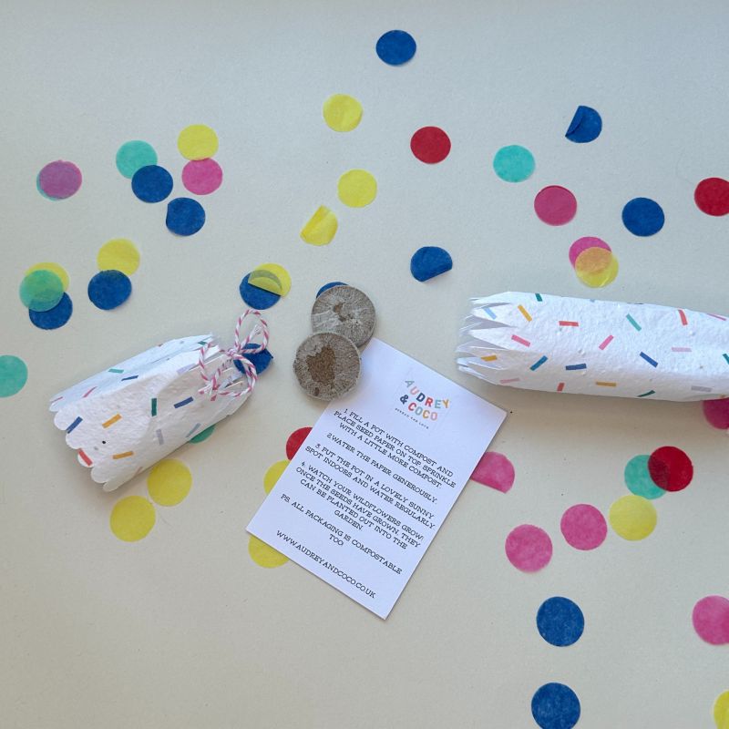 Celebrate your party with these unique, plastic free, zero waste crackers and enjoy wildflowers afterwards! The perfect addition to a eco-conscious party, to fill with sweets or little gifts for your guests, then plant the paper to enjoy wildflowers in your garden.