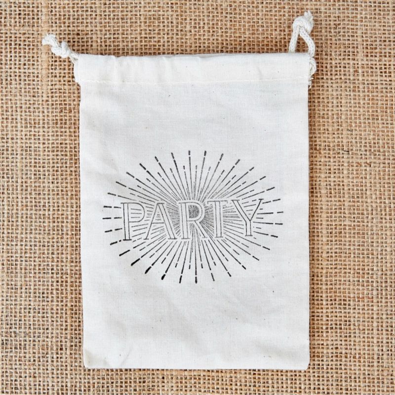 Each Party Bag is made of pure (non-organic) cotton & hand-printed in Worthing (West Sussex) with the word "Party" (see image). They are vegan-friendly & do not use dye. May be disposed of at your local cotton recycling bin.