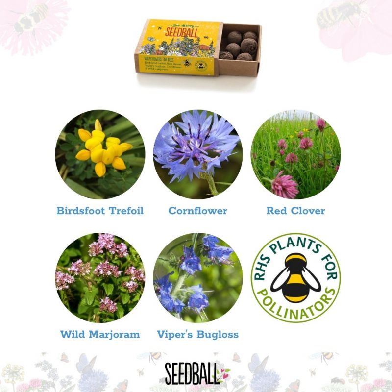 Each box contains a different bee friendly wildflower mix (see below for details), with each seed ball containing approximately 30 seeds. A little card is also included to explain what the balls are and how to use them- they’re incredibly easy to use – simply scatter on top of soil/compost (no digging or expertise required!) and nature will do the rest.